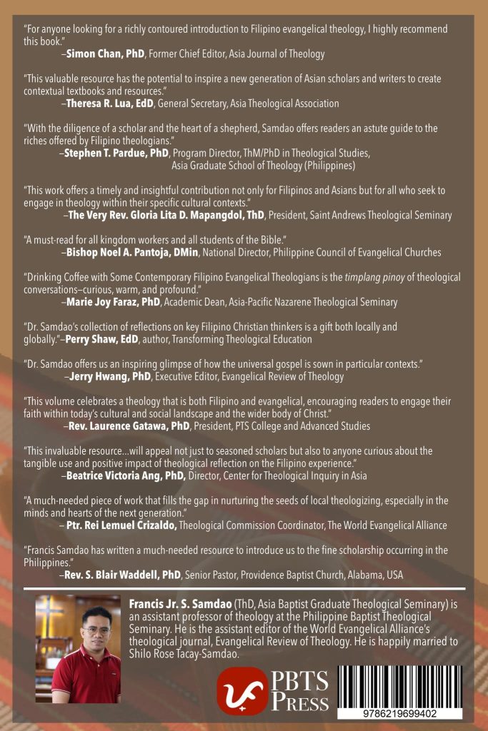January 2026 we will be releasing our first book at PBTS Press. It is “Drinking Coffee with Some Contemporary Filipino Evangelical Theologians.” It is written by PBTS faculty member, Dr. Francis Jr. S. Samdao. Quoting Dr. Theresa Lua (on the back cover), “This valuable resource has the potential to inspire a new generation of Asian scholars and writers to create contextual textbooks and resources.”